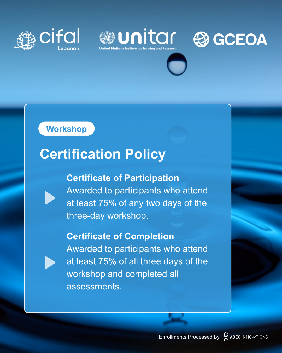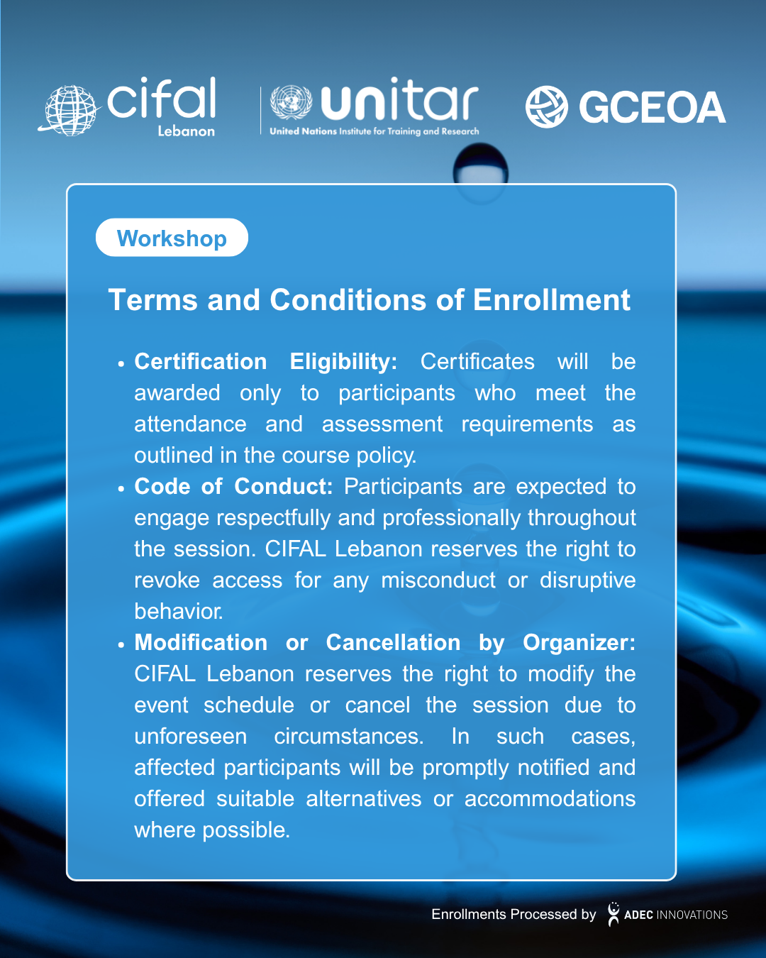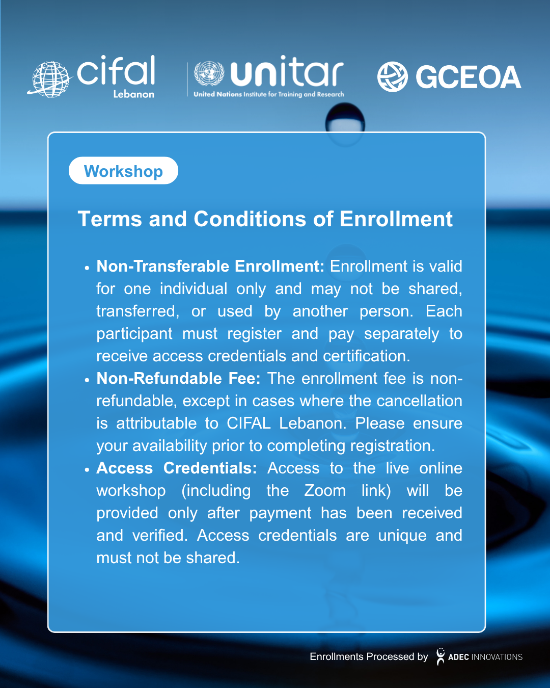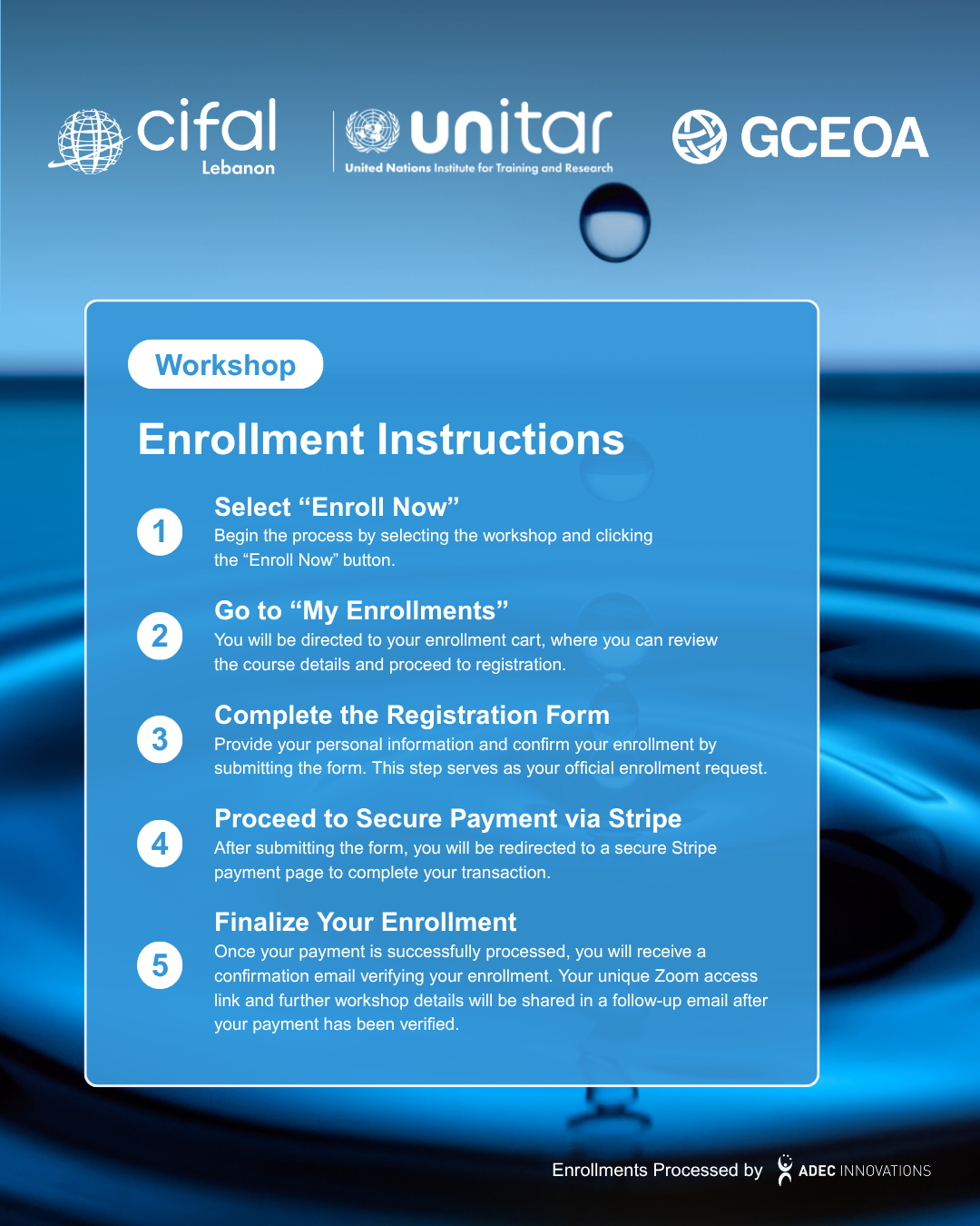 Enrollment registration and payment are managed by Global CEO Alliance in partnership with ADEC Innovations FZ LLE. All enrollment fees for CIFAL Lebanon workshops and courses are securely processed through Stripe. On your bank or card statement, the charge will appear as "CIFAL Fees".
